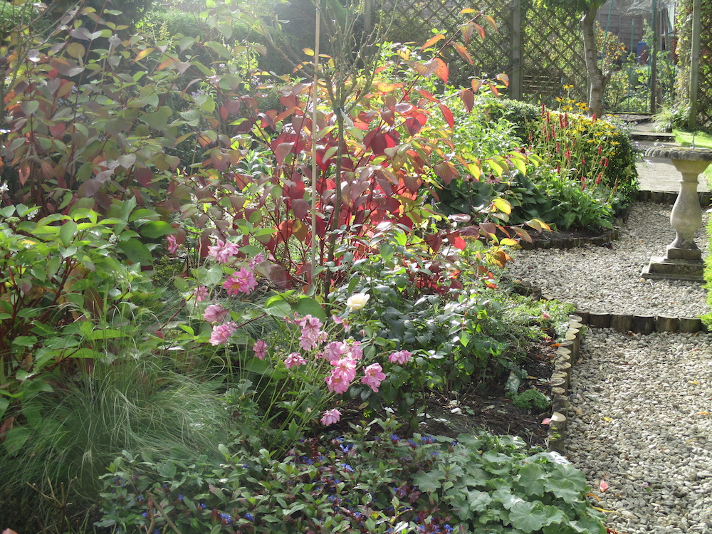 A hot sun baked sloping South West garden needed a complete overhaul, 3 days where needed to remove the deeply entrenched garden growth. The garden consisted of 4 large borders, disease resistant standard roses, herbaceous and evergreen plants where used, the colour scheme was purple Salvias, orange Achillea and peach roses amongst many others. Red and green winter stem plants where used, Cornus Alba ‘Sibirica’ and Cornus sericea ‘Flaviramea’ ensuring interest throughout the seasons. Dainty grasses float around bringing that special added interest. I regularly visit the garden and see how it is developing.